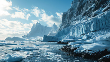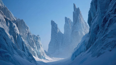 A stunning view of towering glacial peaks surrounded by a vast icy expanse. This serene and captivating landscape showcases the beauty of remote wilderness in winter.