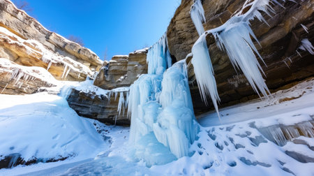 A stunning winter scene featuring a frozen waterfall amidst dramatic ice formations and towering rocky cliffs under a bright blue sky, showcasing natural beauty.