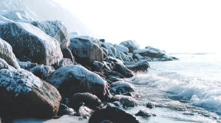 A picturesque winter scene featuring a rugged shoreline with snow-covered rocks and gentle waves. The soft morning light enhances the serene atmosphere.