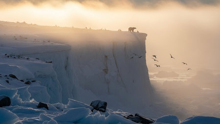 A polar bear stands on the edge of a massive Arctic ice cliff at sunrise, with birds flying by and a breathtaking snowy landscape in the background, evoking a sense of serenity and wonder.