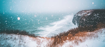 Snowy Coastal Cliffs Overlooking a Stormy Nordic Sea, Moody Icelandic Seascape in Winter