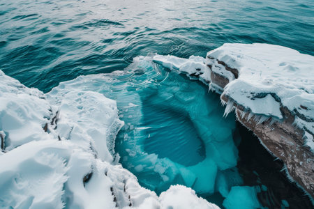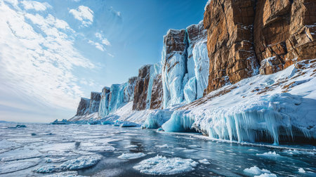 Powerful waves crash against dark cliffs covered in snow and ice Clear details and vibrant colors enhance visu...