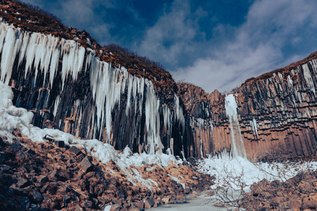 Snow and ice at Skaftafell waterfall in iceland, Vatnajokull national park