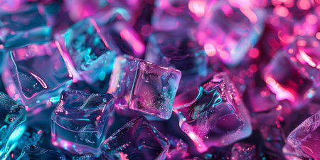 Closeup of sparkling ice cubes reflecting bright neon pink and blue hues, enhancing the captivating visual experience