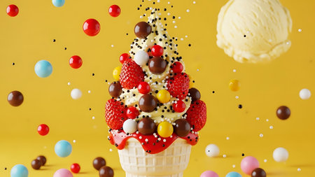 A vibrant ice cream cone with strawberries and chocolate balls, surrounded by candy and sprinkles on a yellow background.