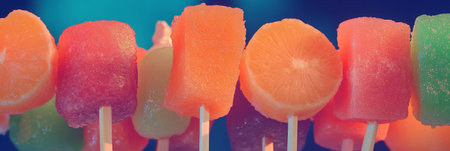 AI Generated. Many colorful Ice creams on a stick with fruits inside