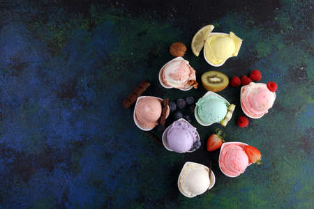 Various of ice cream flavor with fresh blueberry, strawberry, kiwi, lemon, vanilla setup on rustic background . Summer and Sweet ice cream