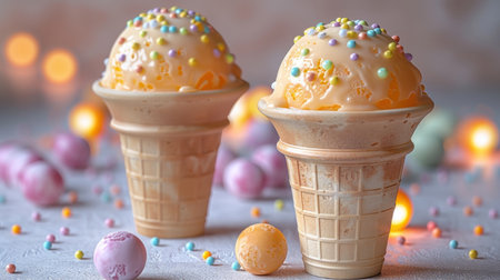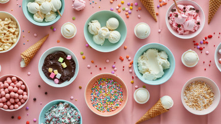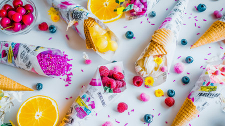 Various ice cream cones are filled with vibrant toppings like fruits, sprinkles, and edible flowers, creating a joyful and inviting arrangement for a summer dessert experience.