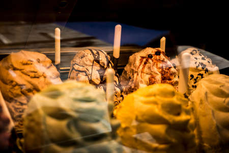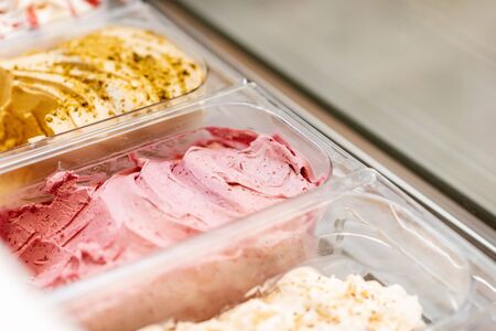 Close-up of ice cream with different flavors in the refrigerator on a shop window