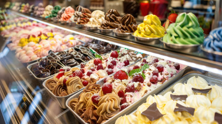 A vibrant assortment of gelato flavors showcases a delightful range of colors and textures, perfect for dessert lovers seeking sweet indulgence in a charming shop setting.