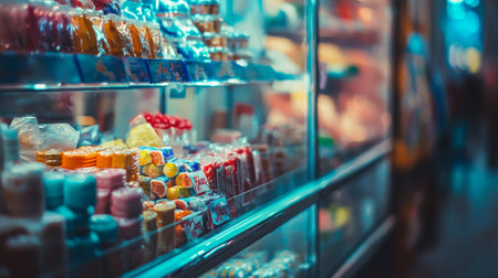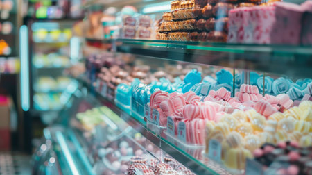 A colorful assortment of sweets and candies displayed in a glass case at a store, creating an inviting and nostalgic feeling of indulgence.