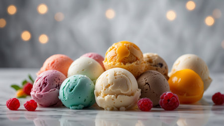 AI Generated. Artisanal Ice Cream Scoops with Colorful Garnishes on Marble Surface