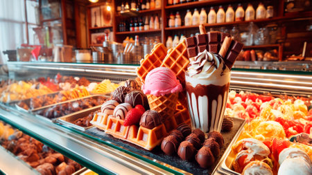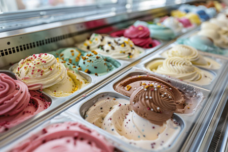 Colorful variety of ice cream flavors displayed in a bustling shop during a warm summer afternoon