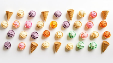Top view photo of many ice cream, colorful, wafer cones, maximalism, isolated pastel white background with copyspace. Generative AI image weber.