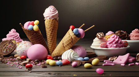 Colorful ice cream scoops topped with various candies and sprinkles, displayed in a row, offering a tempting dessert choice generative ai.
