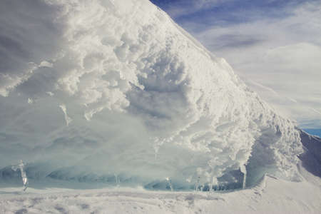 Ice structure. Blue piece of ice on a blue sky with clouds, winter mood for background. Selective focus