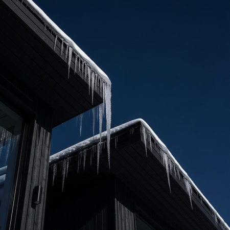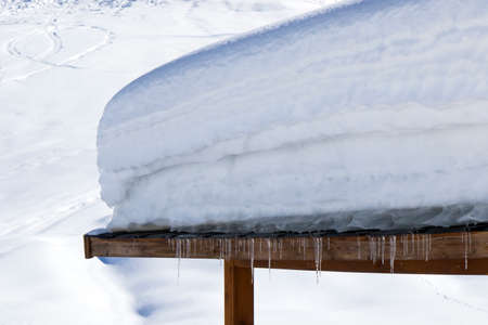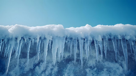 Icicles hanging from a snowy roof, a beautiful winter scene. Cold, icy, and serene.