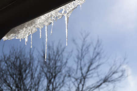 Transparent icicles hanging from the roof in winter.