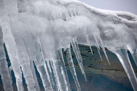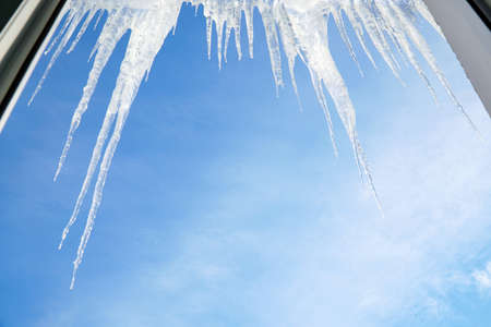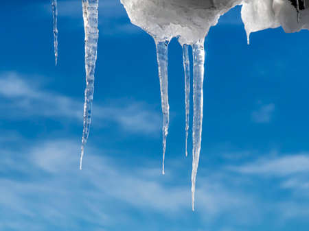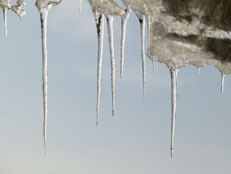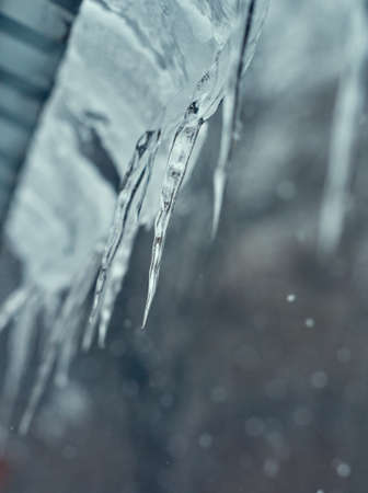 Icicles hanging on the roof. Winter nature abstract art. Physical phenomenon, solid form of water.
