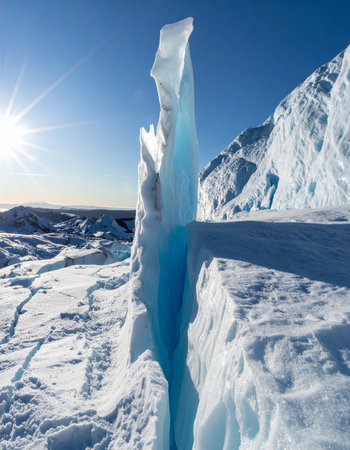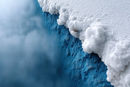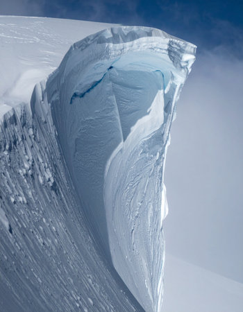 A glacial edge reveals distinct layers of snow and ice, showing brilliant blue hues beneath the surface. The scene captures the raw beauty of frozen wilderness.