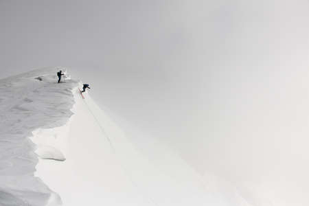 Great view of freeriders on splitboard riding down from top of ridge.