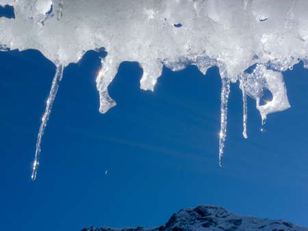 transparent icicles of ice against the blue sky