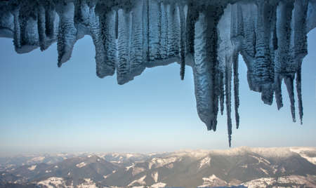 Winter view of Carpathian mountains against blue sky background through icicle frame.