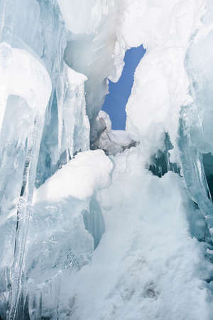 Ice wave on Lake Baikal, winter landscape with icicles and blue sky