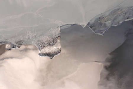 Icicles on ice of the thawing river in the spring