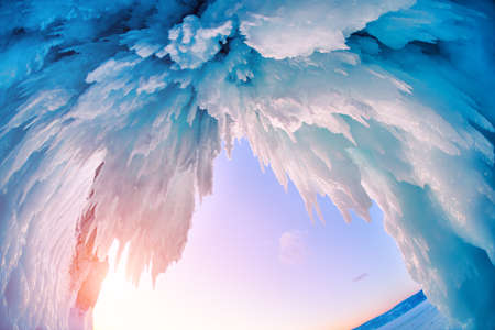Ice cave on Baikal lake in winter. Blue ice and icicles in the sunset sunlight. Olkhon island, Baikal, Siberia, Russia. Beautiful winter landscape.