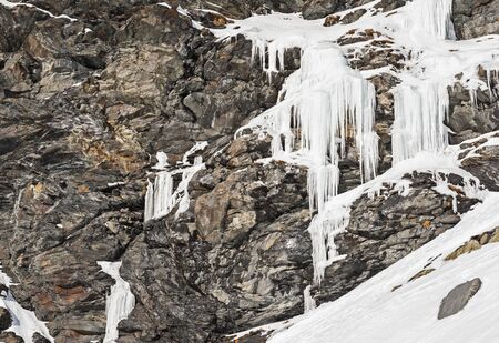 Rugged alpine rocky mountainside landscape with frozen waterfall covered in snow and ice