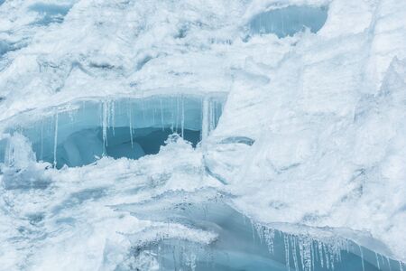 Ice grottoes and icicles on the winter lake Baikal.