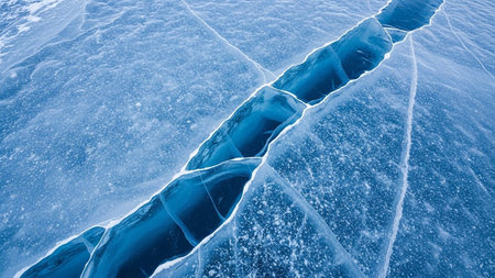 Cracks in the thick ice cover of a frozen lake reveal deep blue water beneath, highlighting natural processes in a cold winter landscape.