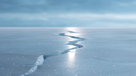 A frozen lake shows distinct cracks in the ice, revealing water beneath. The winter atmosphere is calm, with soft hues reflecting on the ice surface, highlighting the stark beauty of the season.