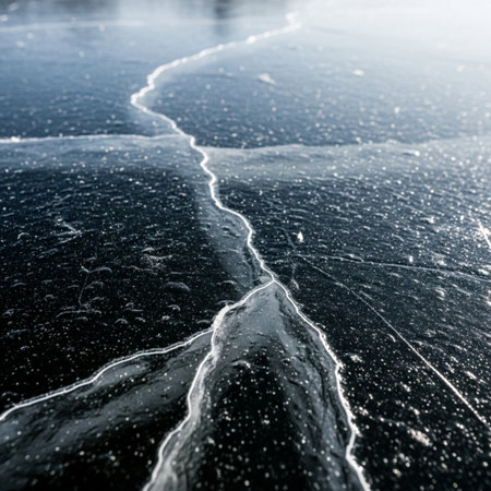 Thick ice covers a lake, showing intricate cracks and fissures, highlighting the contrast with dark water below.