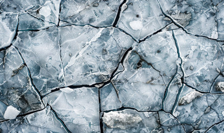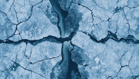 Captivating aerial image showcasing a cracked ice surface with striking blue water peeking through, highlighting nature intricate textures and patterns.