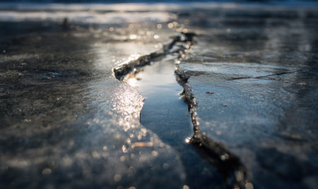 As winter gives way to spring, cracks emerge across the thawing surface of a frozen lake. The shimmering water beneath reflects the changing light and temperatures, marking nature's transition