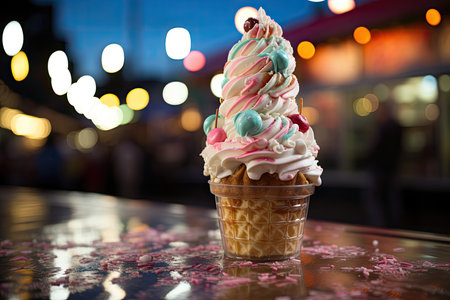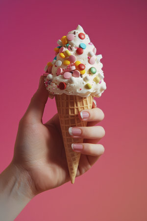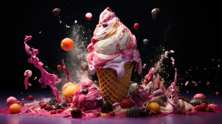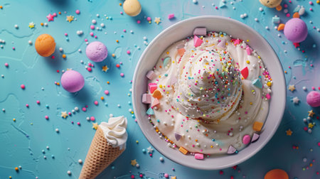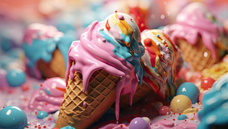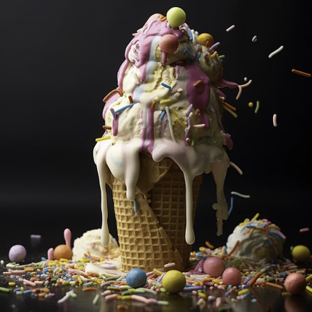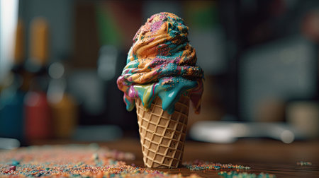 A vibrant rainbow ice cream cone explodes with sprinkles and candy. A joyful, whimsical image.
