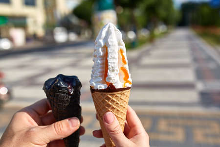 A first person view, sweethearts walking along the road, holding ice cream in their hands and eating it on the colorful pavement background, shallow depth of field. Ice-cream cones are the best summer snack. Sweet refreshing summer food concept.