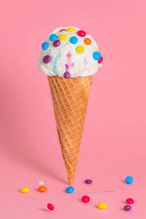 summer funny creative concept of wafer cone with melting ice cream covered and strewed colorful chocolate confetti on pink background