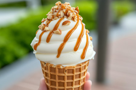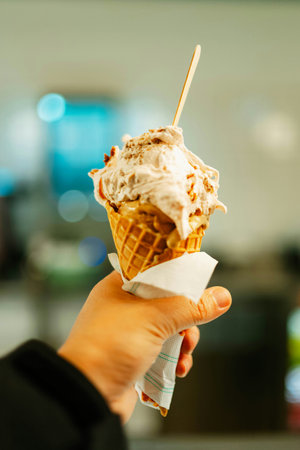Coconut milk ice cream in a crispy waffle cup in woman hand