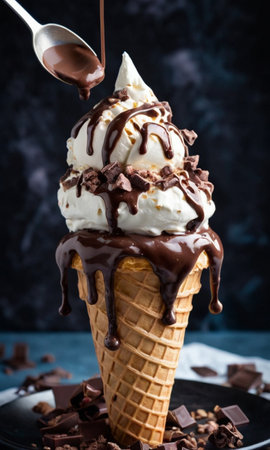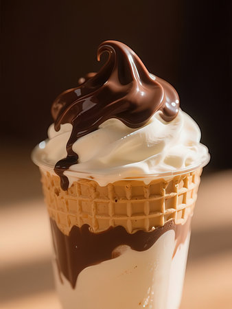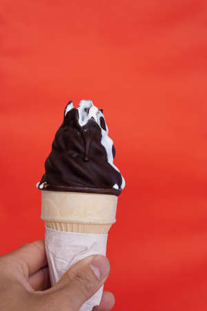 Vanilla and chocolat soft ice cream waffled cone in young hand