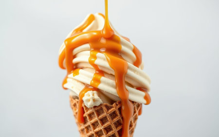 Creamy vanilla and rich chocolate soft serve intertwine in a crispy cone, topped with golden caramel syrup creating an inviting, indulgent treat.