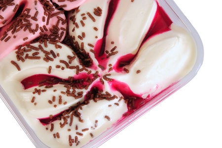 Chocolate and strawberry ice cream, crushed cookies and topping in an ice cream tub. Top view, blank space