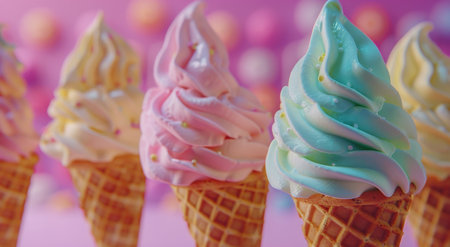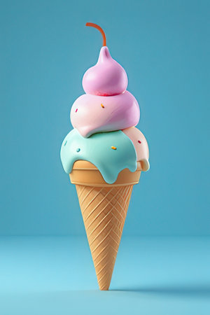 A lively scoop of rainbow-hued ice cream with swirling patterns rests atop a golden waffle cone, set against a gentle pink-to-blue gradient for a joyful summer vibe.