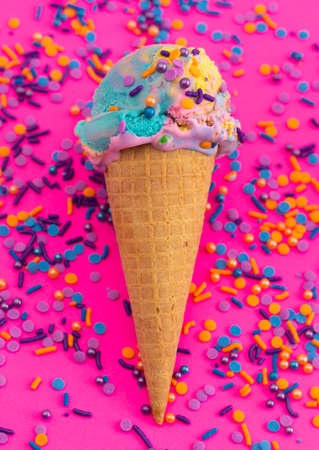Ice vanilla cream with little rainbow sprinkles in a waffle cone and yellowk background