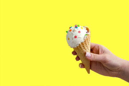 Woman hand holding Ice cream in waffle cone close-up. Sweet summer vanille dessert decorated with colorful sprinkle over yellow background. summer background