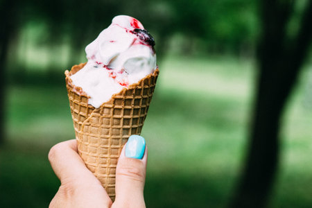 Close-up of a female hand holding an ice cream waffle cone, outdoors. Girl and red ice cream on a hot summer day, cropped image.