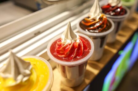 Delicious ice cream are ready to be eaten. Strawberry, vanilla, cherry ice cream