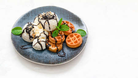 ice cream with waffles, chocolate syrup and fresh mint on a dark platter. copy space